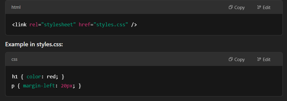 - <link rel=”stylesheet” href=”styles.css” />